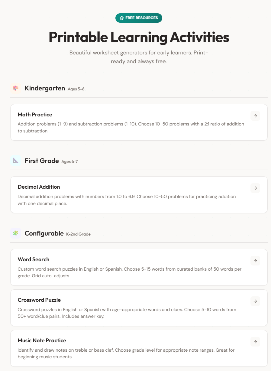 It’s a simple site: pick a grade level, pick a type (addition, decimal math, wordsearch, etc.), set how many problems you want and print. Every refresh randomizes the content. It cost me maybe an hour one afternoon and I’ve printed dozens of sheets from it.